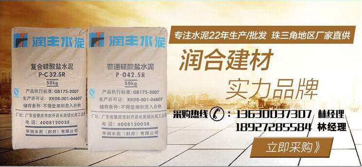 佛山市潤合建材公司 簡稱:廣東潤合。專注水泥22年生產/批發。主營:PC32.5R、PO42.5R、P1142.5R、PO52.5R華潤水泥、三虎水泥、海螺水泥、飛鹿水泥、路路通水泥、長力水泥。及C20、C25、C30、C35、C40、等C60以下混凝土。各大水泥品牌,在水泥采購商中享有較高的品質認可,廣東潤合與多家世界500強企業中鐵、中交、中國建筑和知名房企保利地產、碧桂園地產、龍光地產、美的地產長期合作。各品牌水泥有較大價格優勢,及水泥運輸配送優勢。佛山潤合水泥建材公司,將以薄利多銷及全心全意服務每位客戶。