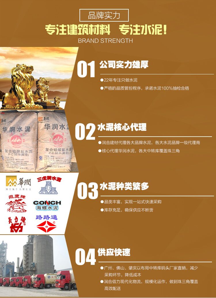 佛山市潤合建材公司 簡稱:廣東潤合。專注水泥22年生產(chǎn)/批發(fā)。主營:PC32.5R、PO42.5R、P1142.5R、PO52.5R華潤水泥、三虎水泥、海螺水泥、飛鹿水泥、路路通水泥、長力水泥。及C20、C25、C30、C35、C40、等C60以下混凝土。各大水泥品牌,在水泥采購商中享有較高的品質(zhì)認(rèn)可,廣東潤合與多家世界500強(qiáng)企業(yè)中鐵、中交、中國建筑和知名房企保利地產(chǎn)、碧桂園地產(chǎn)、龍光地產(chǎn)、美的地產(chǎn)長期合作。各品牌水泥有較大價格優(yōu)勢,及水泥運輸配送優(yōu)勢。佛山潤合水泥建材公司,將以薄利多銷及全心全意服務(wù)每位客戶。